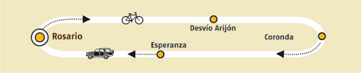 Rosario, Desvío Arijón, Coronda, Esperanza (en bici), Rosario (en auto).