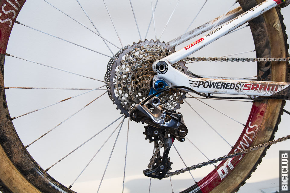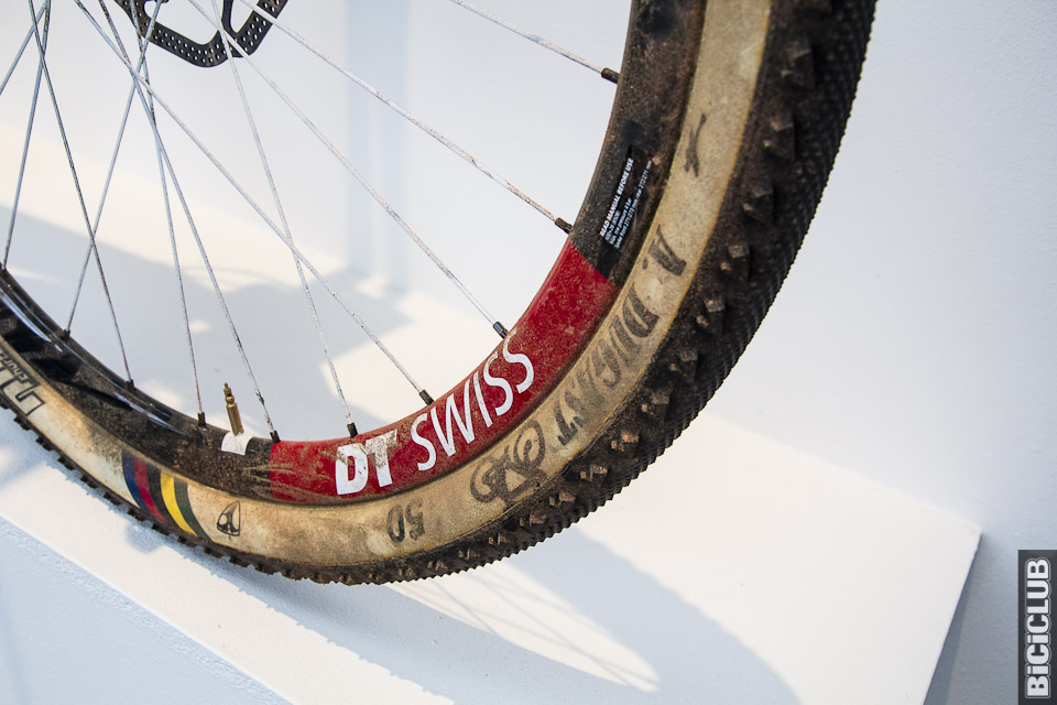 En el mega stand que Scott montó en Eurobike podía verse, entre otras, la bici de su campeonísimo, el suizo Nino Schurter, llegada directo al lugar apenas terminada la última fecha de la World Cup de cross country, sin siquiera lavar. En rodado 27.5, con cuadro de carbono, la máquina está equipada con transmisión Sram XX1, horquilla y shock DT Swiss, ruedas DT Swiss y los finísimos tubulares A. Dugast, especialmente personalizados para Nino.