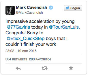 En un tuit que publicó a las 23:02 de ayer, 19 de enero, Martk Cavendish dice: “Impresionante aceleración del joven Gaviria en el Tour de San Luis. ¡Felicitaciones! Pido disculpas a los chicos del Ettix Quick Step por no haber podido terminar su trabajo.”